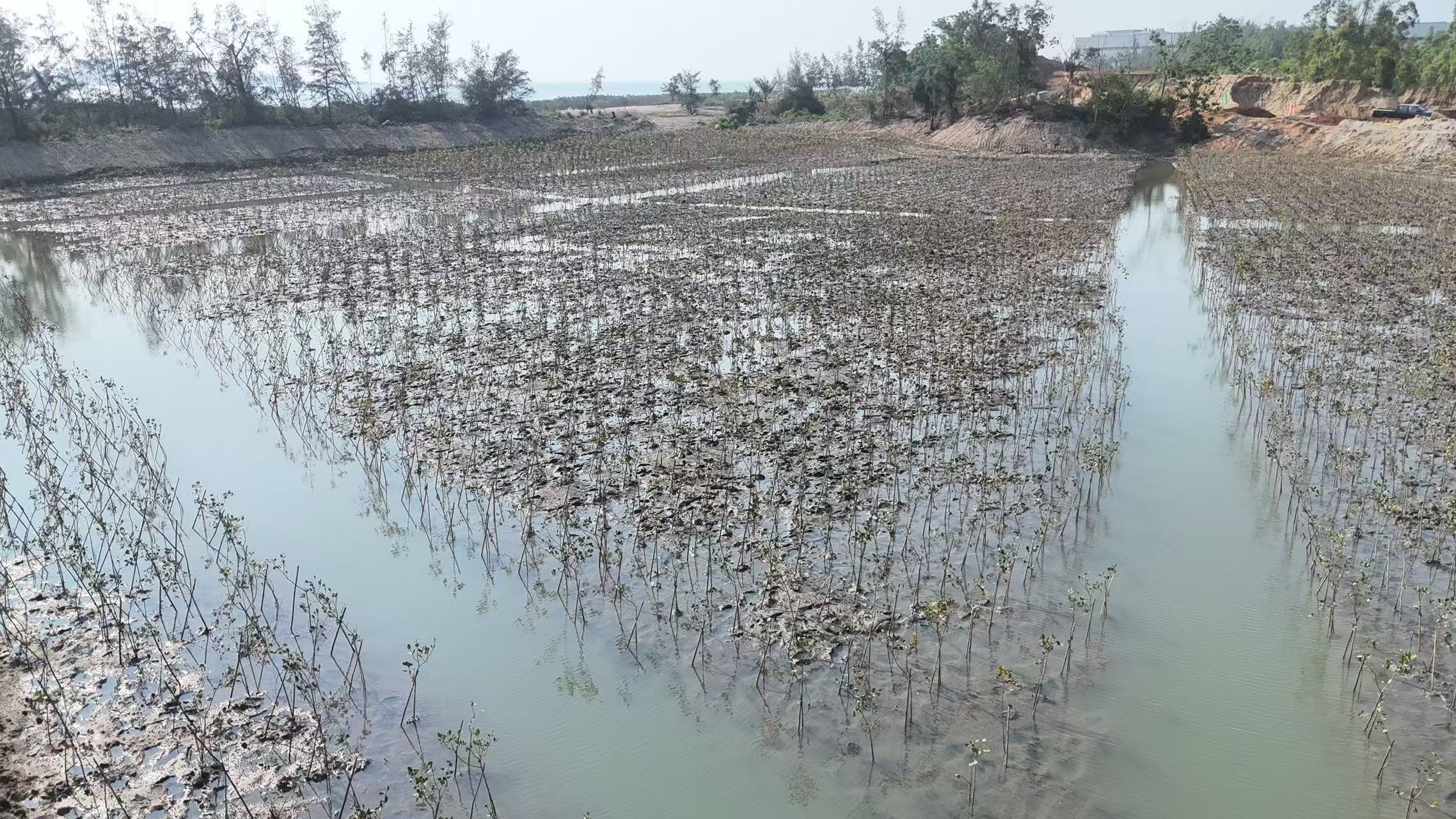 如春生態(tài)集團團隊因地制宜優(yōu)化技術(shù)方案:通過(guò)潮溝開(kāi)挖構建水系網(wǎng)絡(luò ),采用 “白骨壤 + 紅海欖 + 欖李” 塊狀混交模式提升群落抗逆性,并配套圍網(wǎng)防護、竹竿支撐等精細化管護措施,為紅樹(shù)林生長(cháng)創(chuàng )造穩定生境。
