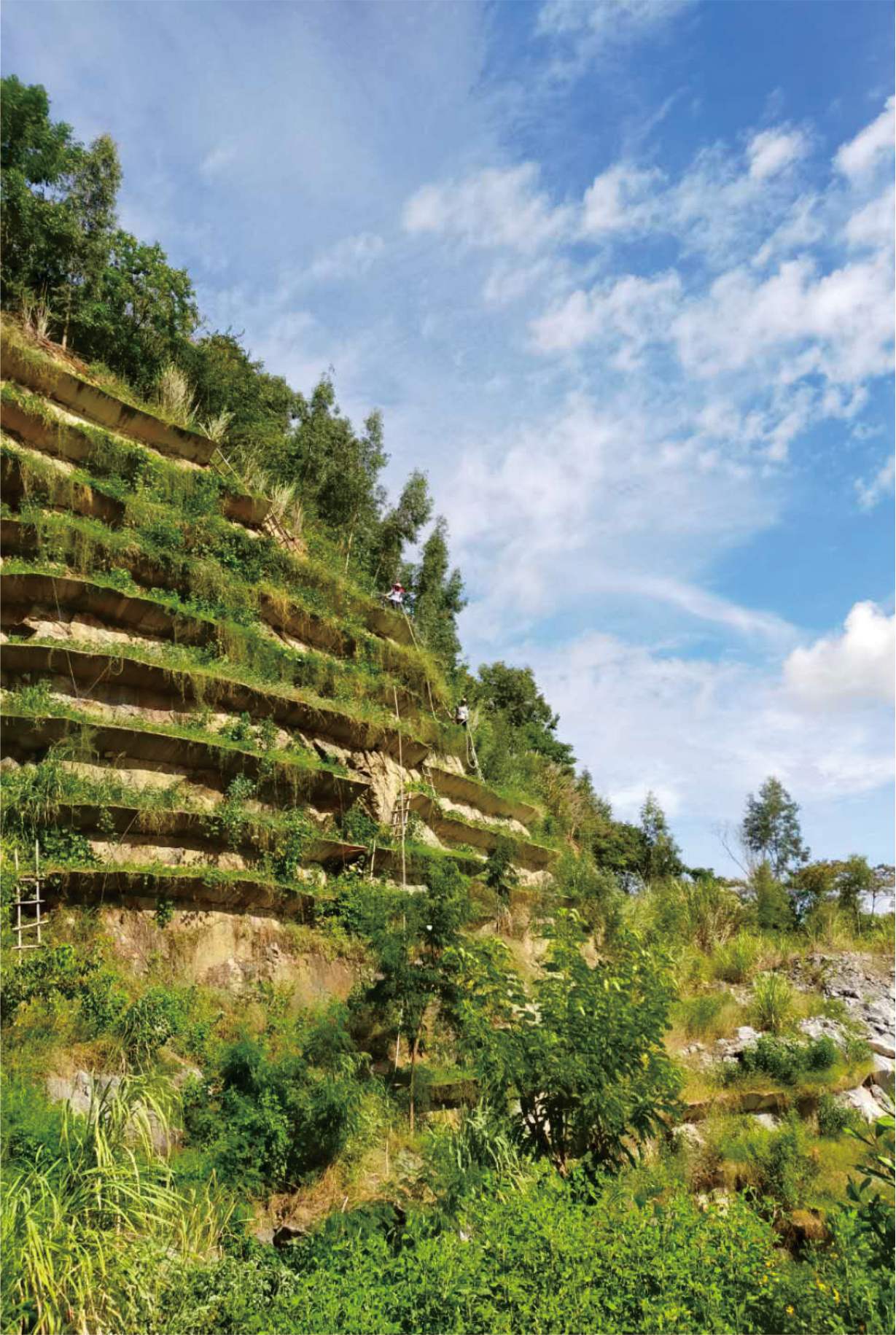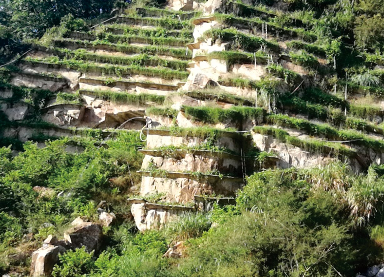 鼓嶺礦山山體修復工程位于儋州市南辰農場(chǎng),已經(jīng)關(guān)閉采石活動(dòng)數年,現需對其進(jìn)行生態(tài)復綠。生態(tài)修復面積約為1.2萬(wàn)平方米(裸露邊坡面積),通過(guò)邊坡清危、錨固、設置灌溉系統,采用客土噴播技術(shù)、“V型”槽技術(shù)、點(diǎn)挖筑穴技術(shù)等復綠方式(種植綠色植物)對南辰農場(chǎng)鼓嶺閉坑礦山山體進(jìn)行綠色生態(tài)修復。